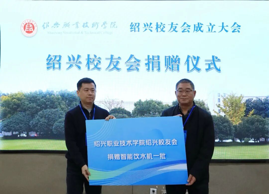 新当选的执行会长、浙江优奕文化传媒有限公司总经理徐一柱代表绍兴校友会向母校捐赠一批智能饮水机,用于改善教学楼师生饮用水条件。