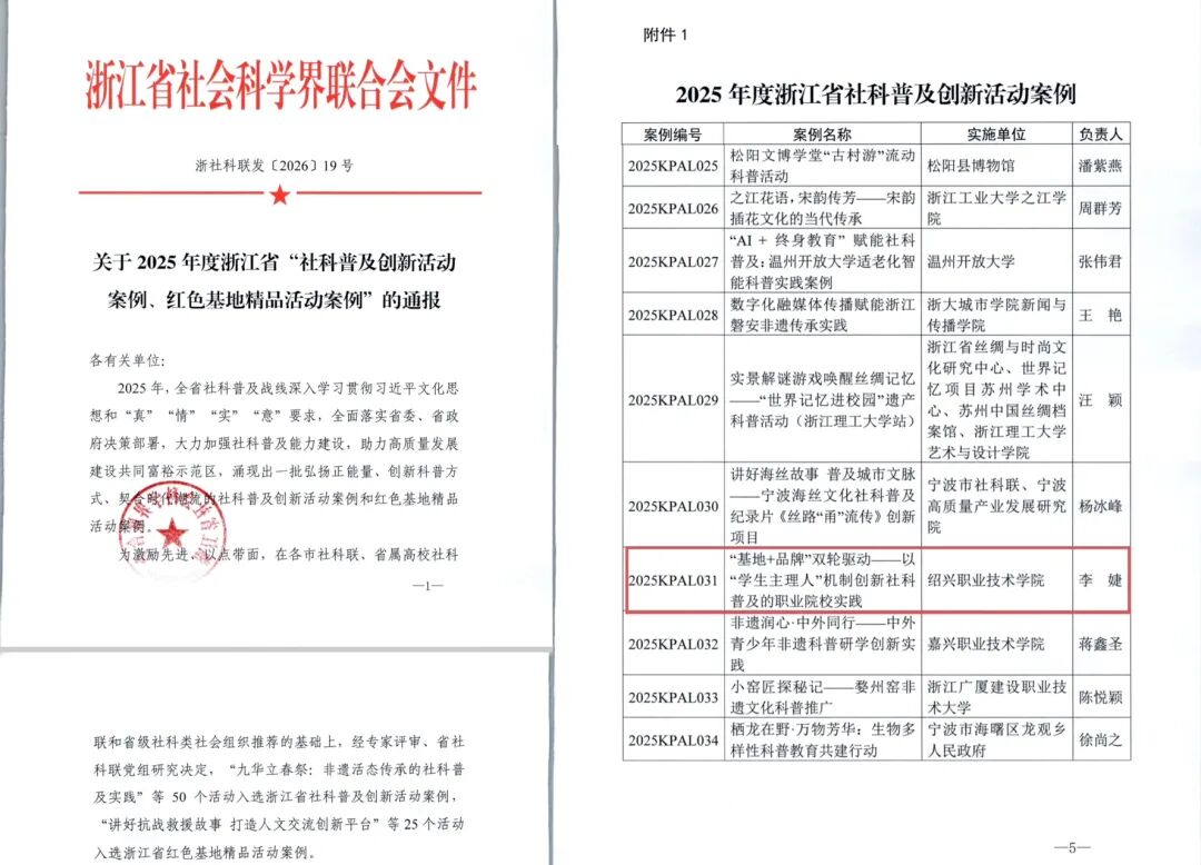 日前,我校申报的《“基地+品牌”双轮驱动——以“学生主理人”机制创新社科普及的职业院校实践》获评2025年度浙江省社科普及创新活动案例。“绍职院和畅悦读联盟”(原“和畅书吧”)正式入选浙江省社科联“浙里·悦读”读书会联盟第五批成员单位。