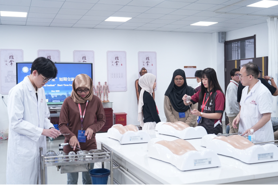 活动期间,“中马越医学堂”学员实地考察绍兴职业技术学院中医药博物馆、护理实训中心、智慧城市产教综合体、书法实践基地、现代商贸服务实训中心、浙江省通用砂浆研究院、安全体验馆、模型馆等实训基地,直观感受学校的教学条件、专业建设与产教融合模式等;在趣味汉语学习中掌握日常对话用语,加入书法课堂,在横竖撇捺间感受中华书法文化的博大精深;聆听中医药知识讲座、近距离感受艾灸、刮痧、推拿、针灸等中医适宜技术,考察绍兴市中医院,共同完成香囊、中医药膳的制作,切实感受中医药文化的深厚底蕴;展开兰亭、鲁迅故里、仓桥直街、黄酒小镇等城市文化之旅,在千年文脉的沉浸式探访中深化文化互鉴;此外,中马师生共上一堂课,共同开展护理技能交流,并邀请马来西亚林肯大学学院护理与应用科学学院副院长Dr. SMITHA POOVATHINKAL MADHAVAN为中外师生带来Nursing Futures: Educate and Elevate讲座,推动国际护理理念互鉴创新。