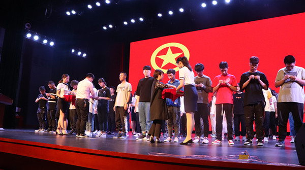 会议隆重表彰了2018-2019学年“五四红旗团委、团支部”等先进集体和“十佳团干部”“十佳团员”“十佳学生干部”等先进个人。先进个人和先进集体代表依次上台领奖,接受祝贺。优秀团员赵博炜同学代表先进个人作表态发言。